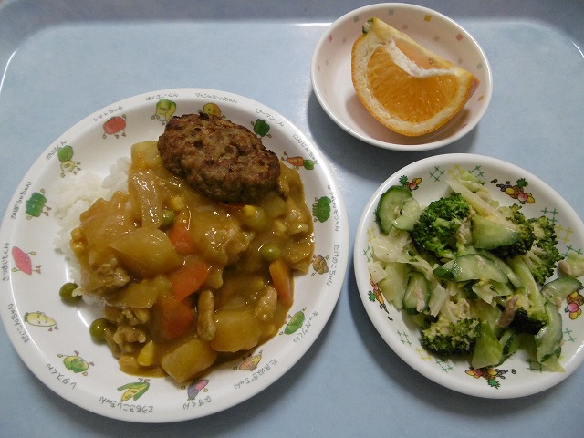 3月6日(月) 給食 ・カレーライス ・ハンバーグ ・グリーンサラダ ・いよかん