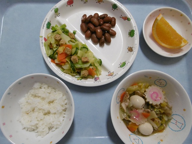 3月7日(火)給食 ・ごはん ・八宝菜 ・クルトンサラダ ・金時豆の甘煮 ・オレンジ