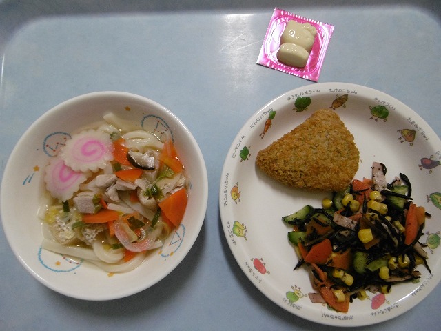 3月8日(水)給食 ・うどん ・かぼちゃ挽肉フライ ・ひじきの中華あえ ・チーズ