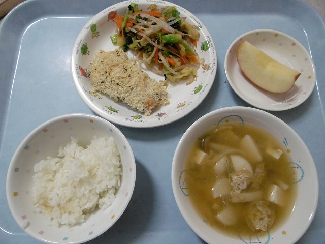 3月9日(木) 給食 ・ごはん ・鮭のサクサク焼き ・小松菜の和え物 ・みそ汁 ・りんご