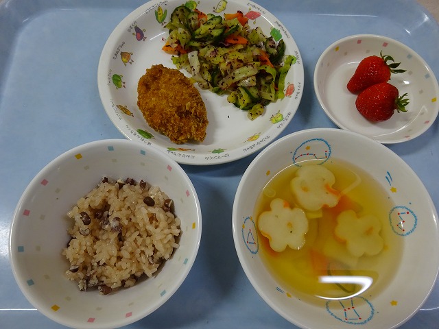 3月10日(金) 給食 ・赤飯 ・ヒレカツ ・ゆかりあえ ・すまし汁 ・いちご