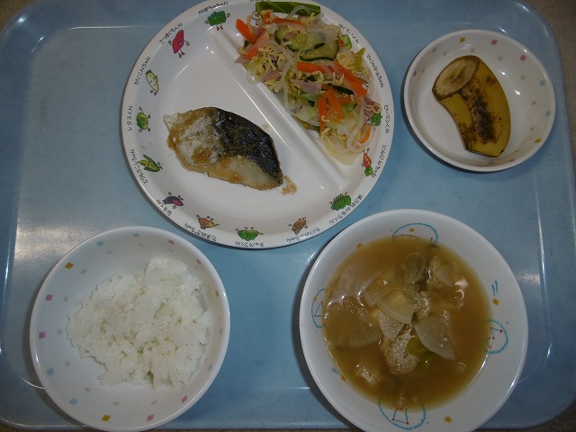 12月1日(木)給食 ・ごはん ・さわらのごまたれかけ ・錦糸酢の物 ・みそ汁 ・バナナ