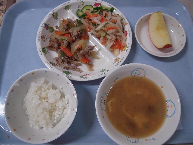 12月13日(火)給食 ・ごはん ・豚肉のしょうが焼き ・だいこんサラダ ・みそ汁 ・りんご