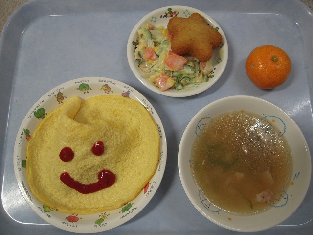12月15日(木)給食 ・オムライス ・星のコロッケ ・キャベツのサラダ ・ABCスープ ・みかん