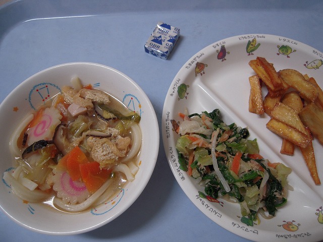 12月16日(金)給食 ・みそ煮込みうどん ・かわりおひたし ・さつまいも揚げマヨ ・チーズ