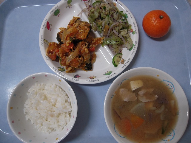 12月21日(水)給食 ・ごはん ・かぼちゃの中華風煮 ・キャベツのゆかりあえ ・豚汁 ・みかん