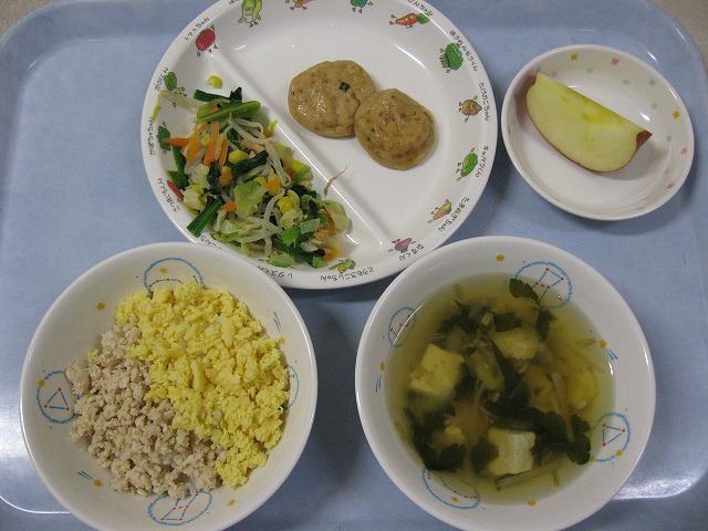 11月28日(月)給食 ・そぼろどんぶり ・もやしナムル ・がんもどき煮物 ・すまし汁 ・りんご
