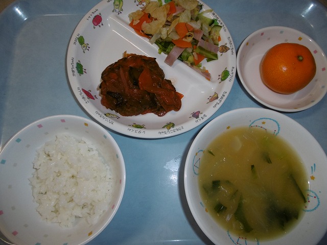 11月30日(水)給食 ・ごはん ・煮込みハンバーグ ・チップスサラダ ・コーンスープ ・みかん