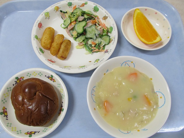 9月23日(金) 給食 ・黒糖ロールパン ・クリームシチュー ・ほうれん草サラダ ・いかフリッター ・オレンジ