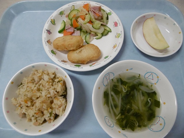 9月26日(月)給食 ・ツナチャーハン ・えびと豆腐のナゲット ・キャベツサラダ ・ABCスープ ・りんご