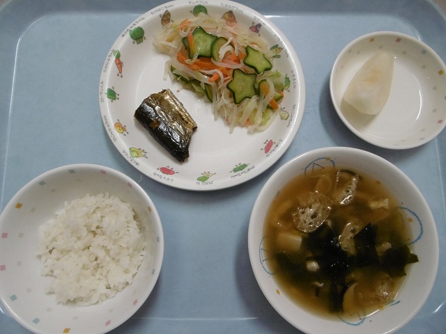 9月27日(火) 給食 ・ごはん ・焼き魚(さんま) ・マロニーの中華あえ ・みそ汁 ・なし