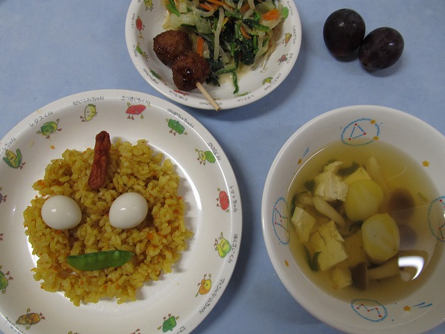 9月28日(水) 給食 ・ウルトラマンライス(カレーピラフ) ・つくね串 ・ほうれん草のごまドレ ・すまし汁 ・きょほう