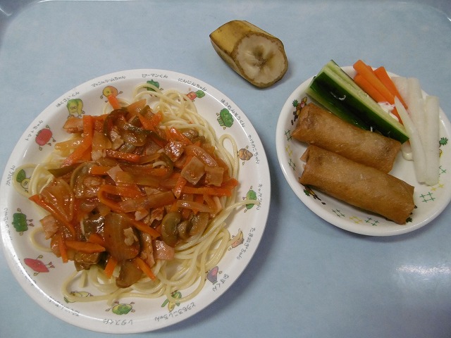 9月29日(木)給食 ・ナポリタンスパゲティ ・ミニはるまき ・スティック野菜 ・バナナ