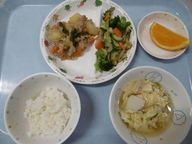 9月30日(金) 給食 ・ごはん ・じゃがいものそぼろ煮 ・ブロッコリーのおかかあえ ・かきたま汁 ・オレンジ