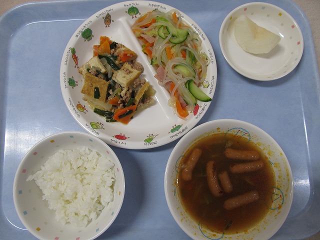 10月3日(月) 給食 ・ごはん ・厚揚げの炒め煮 ・シルバーサラダ ・トマトスープ ・なし