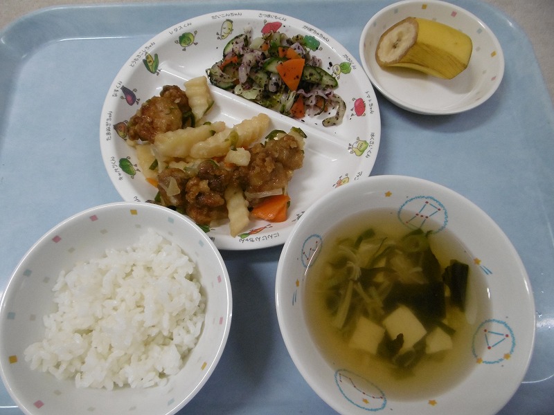 6月17日(金) 給食 ・ごはん ・鶏肉とポテトの揚げ煮 ・キャベツのゆかりあえ ・すまし汁 ・バナナ