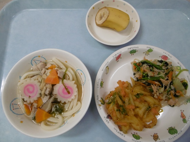 6月21日(火) 給食 ・うどん ・野菜かき揚げ ・かわりおひたし ・バナナ