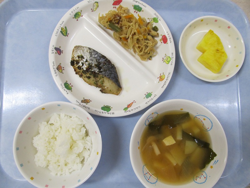 6月23日(木) 給食 ・ごはん ・さわらの香草焼き ・切干大根の煮物 ・みそ汁 ・パイナップル