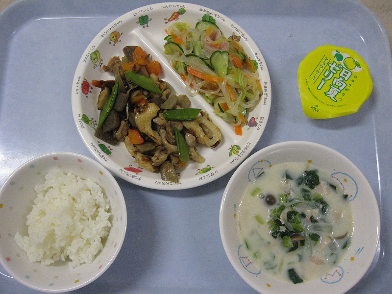6月24日(金) 給食 ・ごはん ・筑前煮 ・マロニーの中華あえ ・豆乳スープ ・日向夏ゼリー
