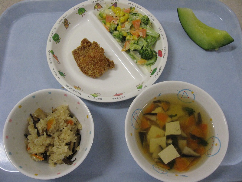 6月29日(水) 給食 ・山菜ごはん ・チキンカツ ・フレンチサラダ ・すまし汁 ・メロン