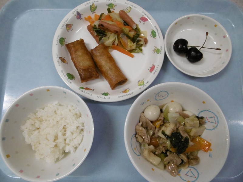 6月30日(木) 給食 ・ごはん ・八宝菜 ・三色ソテー ・ミニはるまき ・アメリカンチェリー