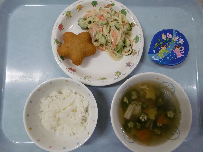 7月7日(木) 給食《たなばたメニュー》 ・ごはん ・星のコロッケ ・スパゲティサラダ ・すまし汁 ・キラキラゼリー お星さまを散りばめた七夕メニュー。コロッケとすまし汁のかまぼこ、オクラの輪切りは、星形でした。 みんなの願いが夜空のお星さまに届き、願いがかないますように!