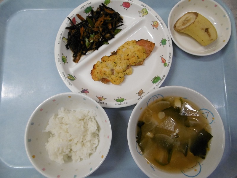 5月31日(火) 給食 ・ごはん ・鮭の菜種焼き ・ひじきの煮物 ・みそ汁 ・バナナ