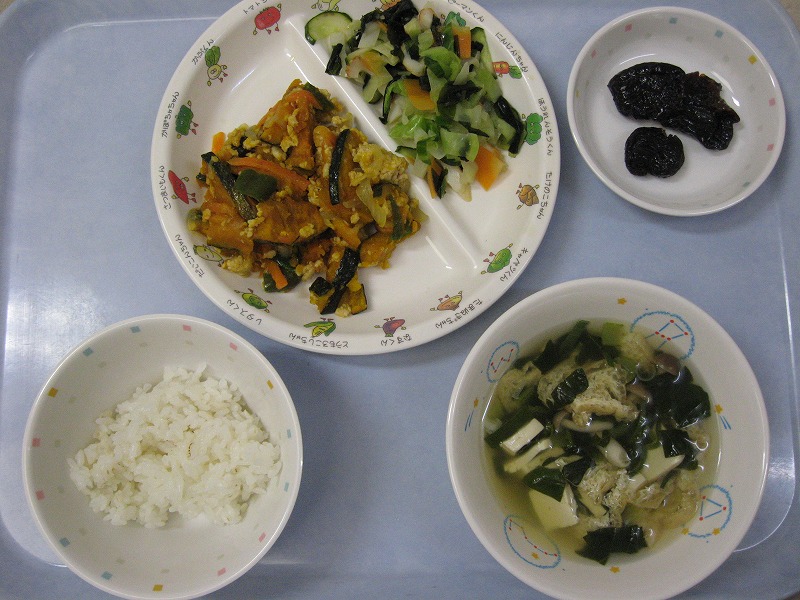 6月2日(木) 給食 ・ごはん ・かぼちゃ中華風煮 ・きゅうりの酢の物 ・すまし汁 ・プルーン
