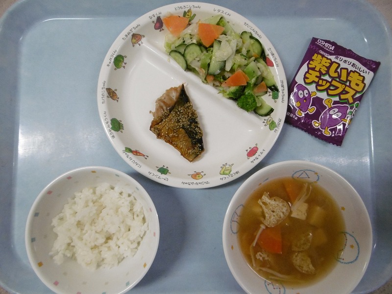 6月7日(火) 給食 ・ごはん ・さばのごまだれかけ ・コールスローサラダ ・みそ汁 ・紫いもチップス