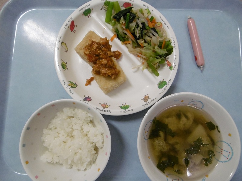 6月9日(木) 給食 ・ごはん ・揚げ豆腐の鶏みそかけ ・小松菜のおひたし ・すまし汁 ・ソーセージ