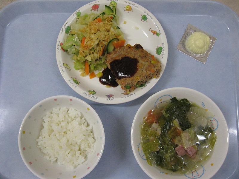 6月14日(火) 給食 ・ごはん ・ミートローフ ・チップスサラダ ・レタススープ ・チーズ