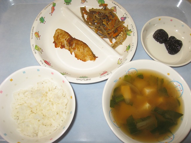 4月20日(水) 給食 ・ごはん ・白身魚のカレー焼き ・五目きんぴら ・みそ汁 ・プルーン