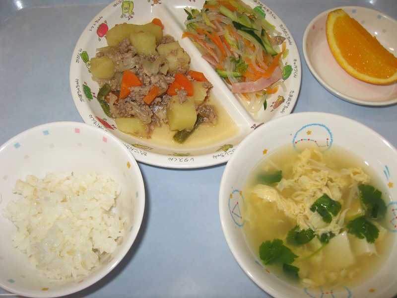 4月27日(水) 給食 ・ごはん ・じゃがいものそぼろ煮 ・マロニーの中華あえ ・かき玉汁 ・オレンジ