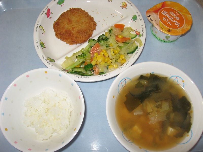 4月28日(木) 給食 ・ごはん ・鮭のなかおち野菜カツ ・フレンチサラダ ・みそ汁 ・みかんゼリー