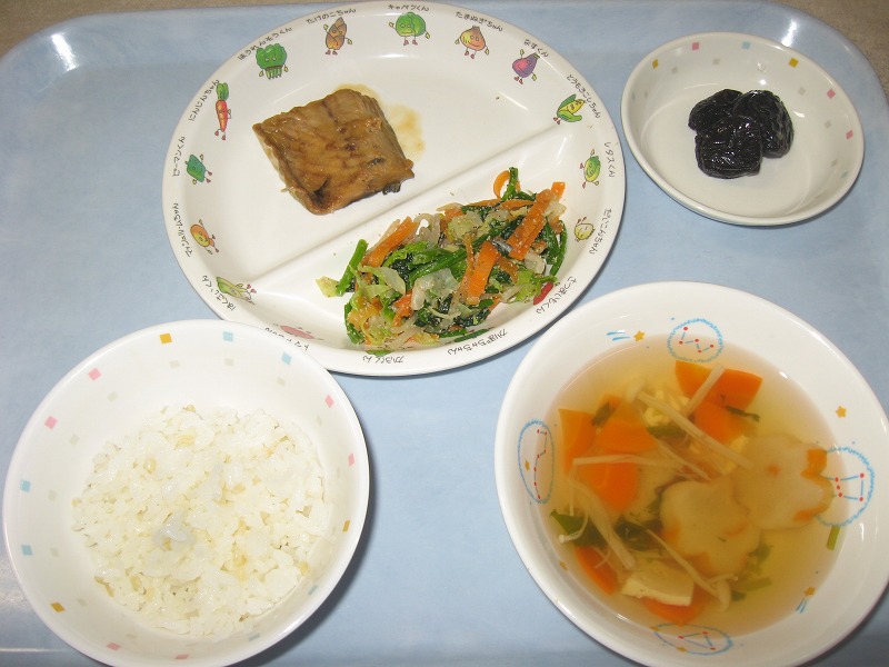 5月10日(火) 給食 ・ごはん ・さばのみそ煮 ・ほうれん草のごまあえ ・すまし汁 ・プルーン