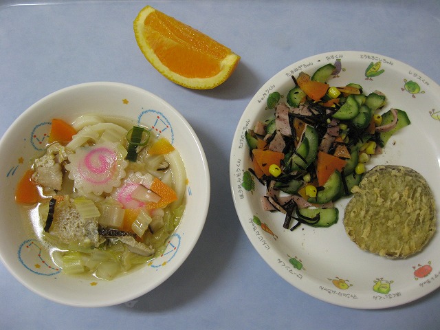 3月10日(木) 給食 ・煮込みうどん ・さつまいもの天ぷら ・ひじきの中華和え ・オレンジ
