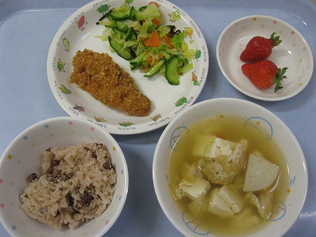 3月11日(金) 給食 ・赤飯 ・ヒレカツ ・キャベツの塩昆布あえ ・すまし汁 ・いちご ※3月お誕生会 お祝いメニューです。