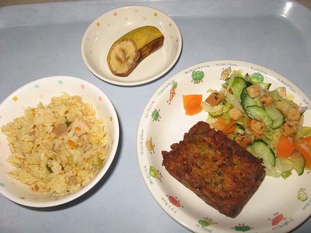 3月14日(月) 給食 ・五目チャーハン ・いかとあおさの豆腐焼き ・クルトンサラダ ・バナナ
