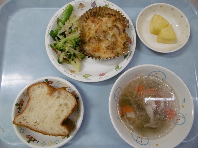 3月15日(火) 給食 ・デニィッシュパン ・マカロニグラタン ・グリーンサラダ ・パイナップル 今日の給食は、年少と年中が、遊戯室で食べました。いつものクラスのお友達とではなく、交流しながらみんな楽しそうでした。