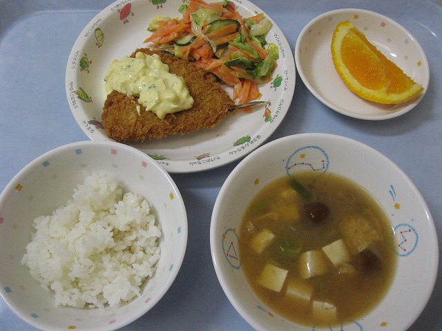 3月23日(水) 給食 ・ごはん ・あじのフライ(タルタルソース) ・にんじんサラダ ・みそ汁 ・オレンジ