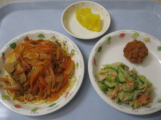 3月24日(木) 給食 ・ナポリタンスパゲティ ・フレンチサラダ ・鹿の子えび団子揚げ ・パイナップル