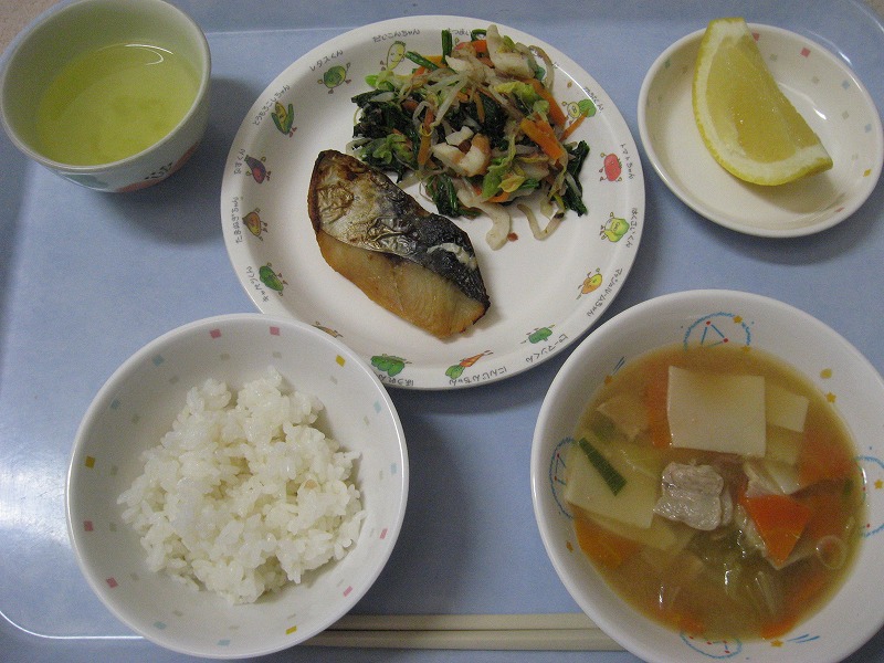 ☆10月8日(木) 給食 ・ごはん ・さわらの照り焼き ・ほうれん草のおひたし ・みそワンタンスープ ・グレープフルーツ