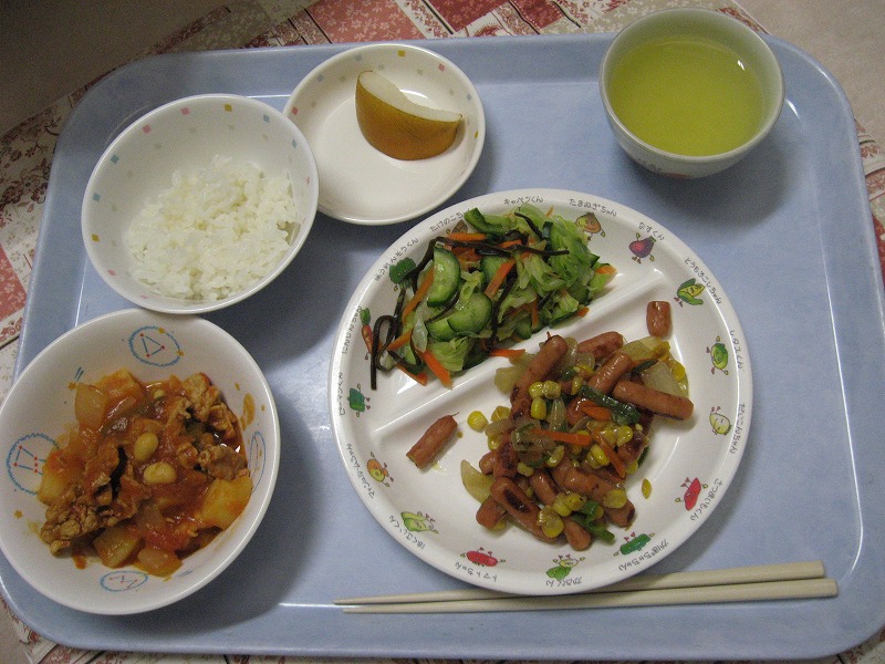 ☆10月9日(金) 給食 ・ごはん ・大豆のトマト煮 ・三色ソテー ・キャベツの塩昆布あえ ・なし