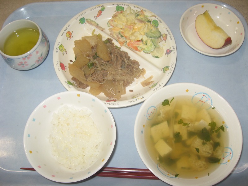 ☆10月14日(水) 給食 ・ごはん ・牛肉と大根の炒り煮 ・ポテトサラダ ・すまし汁 ・りんご
