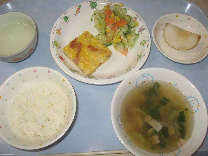 ☆10月15日(木) 給食 ・ごはん ・野菜のキッシュ ・コールスローサラダ ・コンソメスープ ・なし