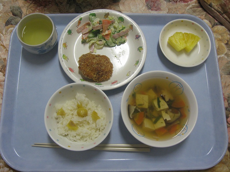 ☆10月28日(水)給食 ・くりごはん ・チキンカツ ・キャベツサラダ ・すまし汁