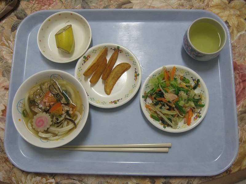 ☆10月29日(木)給食 ・煮込みうどん ・かわりおひたし ・フライドポテト ・バナナ