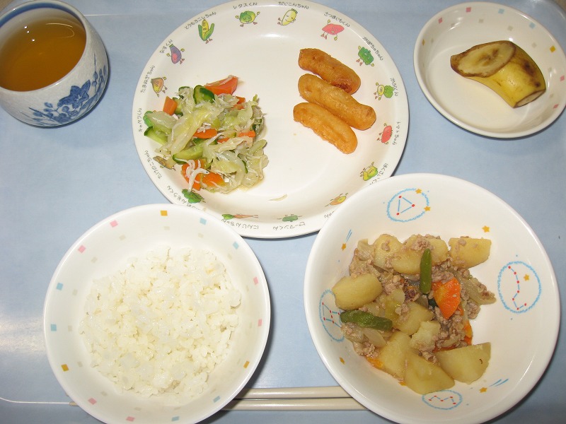 ☆10月1日(木) 給食 ・ごはん ・じゃがいものそぼろ煮 ・キャベツの甘酢あえ ・いかフリッター ・バナナ