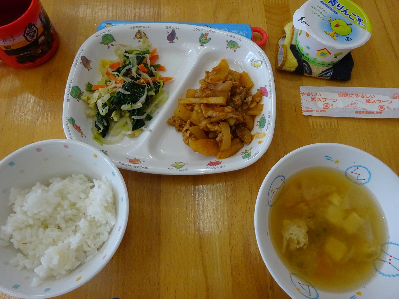 1月26日(木)給食 ・ごはん ・鶏肉の香味焼き ・五目きんぴら(ごぼう・豚肉・にんじん・れんこん・いんげん) ・みそ汁(豆腐・油揚げ・キャベツ・にんじん・わかめ・みそ) ・バナナ