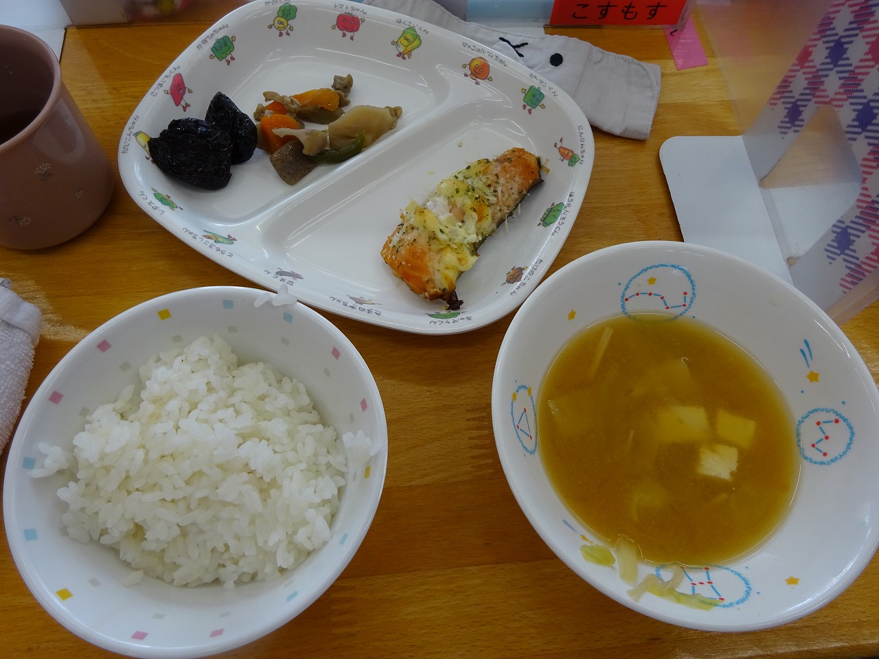11月28日(月) ・ごはん ・鮭のパン粉焼き(さけ・マヨドレ・パン粉・粉チーズ・パセリ) ・筑前煮(鶏肉・ごぼう・にんじん・れんこん・だいこん・いんげん) ・みそ汁(豆腐・キャベツ・玉ねぎ・えのきたけ・みそ) ・プルーン